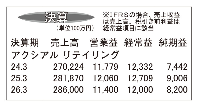 アクシアル リテイリングは5日、26年3月期第1四半期決算を発表した。売上高は第1四半期としては過去最高の712億4400万円(前年比7.1%増)、営業利益27億4900万円(同3.6%増)、経常利益28億3500万円(同2.5%増)、純利益19億1…続きを読む