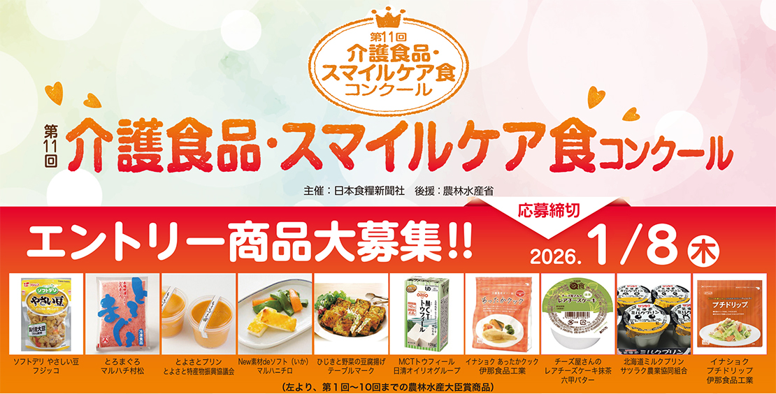 介護食品の品質向上や市場の拡大を目的として、国内で販売されている介護食品・スマイルケア食もしくは同様の機能性を持つ優れた商品を表彰する「第11回 介護食品・スマイルケア食コンクール」(主催:日本食糧新聞社 後援:農林水産省)のエントリー商品を2026年1月8日まで募集します。