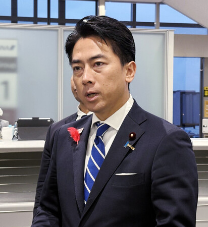 取材に応じる小泉進次郎農林水産相=1日午後、千葉・成田空港
