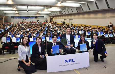 東京都港区のNEC本社では、森田隆之社長を模した人工知能(AI)アバターが登場。学生の質問に、