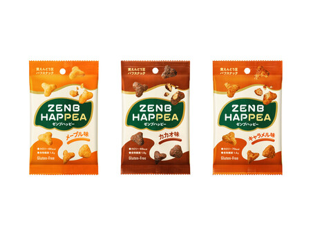 ZENB JAPAN(愛知県半田市)は黄エンドウ豆のスナック「ZENB HAPPEA(ゼンブ ハッピー)」を公式サイトなどで発売。1袋約70キロカロリーと低カロリー、低糖質でダイエット中でも気軽に食べられるという。食物繊維や鉄分、ポリフェノールなども取れる。味はカカオ、メープル、キャラメルの3種類
