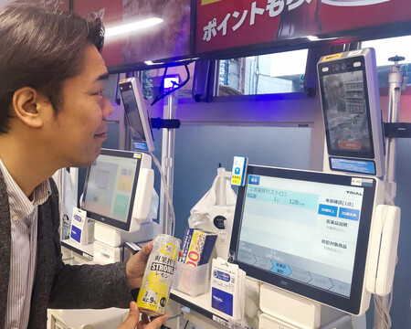 「トライアルGO」の新店舗に導入されたセルフレジ。顔認証機能を搭載したカメラを通じて年齢確認が必要な商品の購入もできる=7日、東京都杉並区