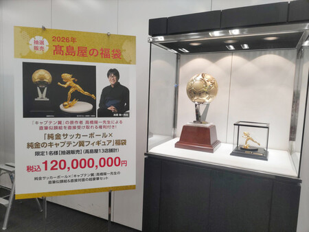 高島屋が販売する「キャプテン翼」主人公の純金フィギュアと純金のサッカーボール=5日、東京都中央区