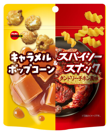 ブルボンのスナック菓子「キャラメルポップコーン&スパイシースナックタンドリーチキン風味」(同社提供)