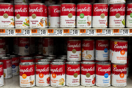 陳列棚に並ぶ米食品大手ザ・キャンベルズ・カンパニーの缶入りスープ=2024年9月、マサチューセッツ州ウーバン(EPA時事)