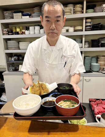 カキフライ定食を差し出す「広島料理 安芸」の岩見政夫さん=1日、東京都新宿区