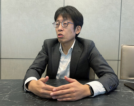 インタビューに答えるベインキャピタルの西直史パートナー=2日、東京都千代田区