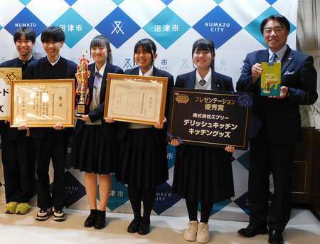 「全国高校フードグランプリ」で大賞を受賞した商品を掲げる静岡県沼津市の頼重秀一市長(右端)と商品開発に当たった沼津商業高の生徒ら=16日、同市役所