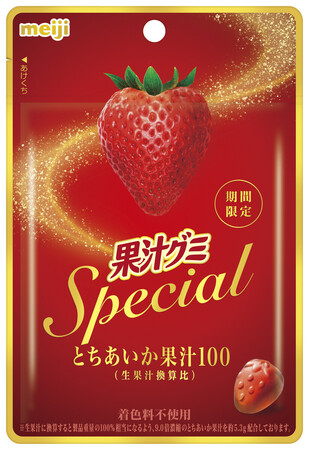 明治(東京)は、グミキャンディー「果汁グミSpecialとちあいか」をコンビニと駅売店で期間限定発売。果物の品種や産地を厳選したグミの新シリーズの第1弾として、穏やかな酸味が特徴の栃木県産イチゴ「とちあいか」の果汁を使った。ランダムでハート型のグミが入っている。47グラム入りで、市場想定価格は24