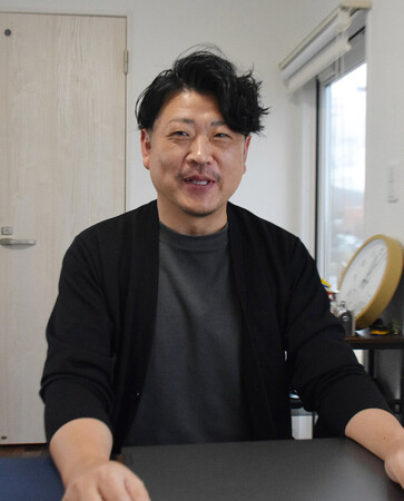 仮設事務所で事業再開の準備をする井淵康仁さん=2025年11月18日、石川県珠洲市