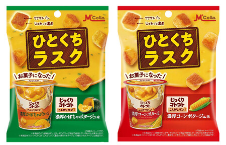 三菱食品の「ひとくちラスク じっくりコトコト 濃厚コーンポタージュ味」「ひとくちラスク じっくりコトコト 濃厚かぼちゃポタージュ味」(同社提供)