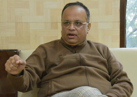 取材に応じるギグワーカー労働組合のサンジェイ・ガバ代表=16日、ニューデリー