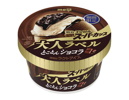 明治(東京)は、大人向けアイス「明治 エッセル スーパーカップ 大人ラベル とことんショコラ」をコンビニ先行で期間限定発売。苦味を強調したビターチョコアイスに、ブランデーの香りを付けたチョコソースをかけ、コクのあるチョコアイスを重ねた。表面には、ほろ苦いクッキーとチョコを敷き詰めた。希望小売価格は