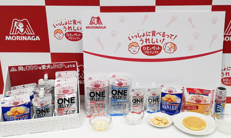 森永製菓が発売する、愛犬と一緒に食べられるおやつ7品=19日午後、東京都港区