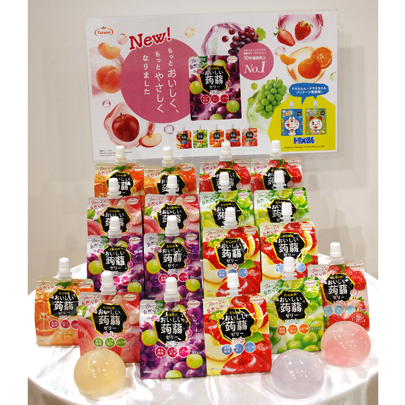 たらみは2026年春夏、「おいしい蒟蒻ゼリー」の食シーン拡大を強める。ライフスタイルの変化や食べ方の多様化に対応し、中身とパッケージをブラッシュアップ。近年の猛暑下の生活に対応した、凍らせて食べるトレンドもつかむ。新キャラクターラインでは「ドラえもん」オリジナルデザインのアイテムを拡充し、子どものおやつニーズを中心に展開を強化する。(小澤弘教)