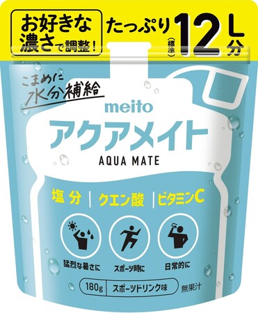 meitoは、スポーツ時の水分補給に適した粉末飲料「アクアメイト」を3月2日、全国のスーパーなどで発売。体液より浸透圧が低いハイポトニック飲料で、素早く水分を補給しつつ、塩分、クエン酸、ビタミンCを同時に摂取できる。かんきつ系の香りと酸味が利いた、のどごしのよい爽やかな味わいが特徴という。1リット