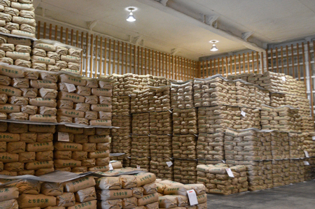 2025年産米が積まれている低温倉庫=25年10月、栃木県大田原市