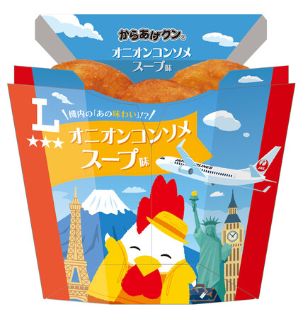 ローソン(東京)は日本航空とコラボした揚げ物「からあげクン オニオンコンソメスープ味」を発売。日航の機内食開発チームが監修し、国際線の機内で提供している「オニオンコンソメスープ」の味わいを再現した。タマネギの甘さやコンソメの風味を楽しめる。パッケージには航空機や世界各地の風景などをデザインした。価