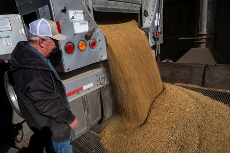 米メリーランド州の穀物販売店で、トラックから大豆を降ろす農家=2025年10月(AFP時事)