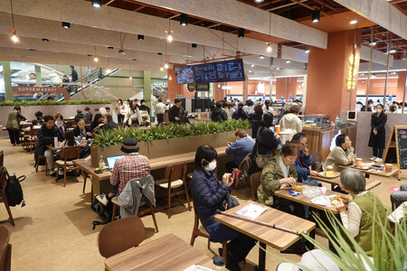 イオンの駅ビル新店舗「イオンモール津田沼 South(サウス)」の総菜コーナーに設けられたイートインスペース=18日、千葉県習志野市