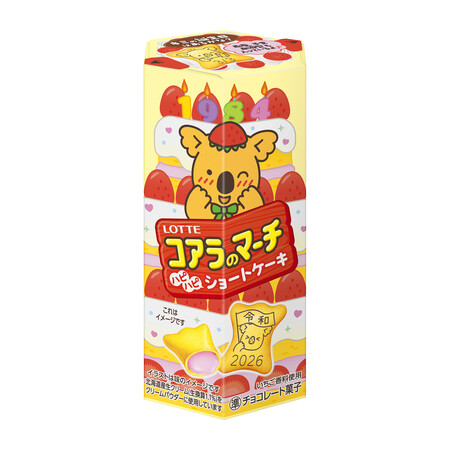 ロッテ(東京)は、チョコレート菓子「コアラのマーチ〈ハピハピショートケーキ〉」を数量限定で発売。北海道産生クリームを練り込んだビスケット生地でイチゴ風味のチョコを包み、ショートケーキの味わいを表現した。生地には西暦や日付、干支(えと)などをそれぞれ刻印。約17万通りの絵柄で、自分や大切な人の記念日