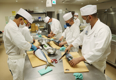 高級すし店などを展開する「銀座おのでら」による独自のすし研修で、講師役のすし職人(右手前から2人目)から、魚のさばき方を学ぶフィリピン出身の特定技能(外食)資格取得者たち=2022年11月、東京都世田谷区