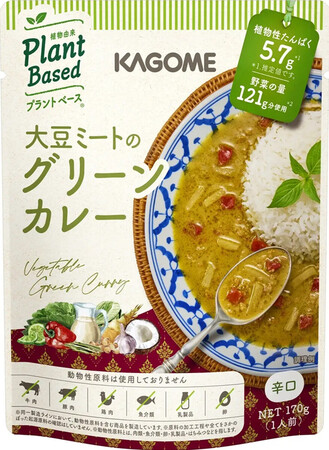 カゴメは、植物性素材のみで作ったレトルト食品「大豆ミートのグリーンカレー」を、全国のスーパーなどで発売。121グラム分の野菜を使用し、ココナツミルクの甘さと、ハーブやライムの爽やかな香りが特徴。大豆ミートにより、しっかりとした食べ応えに仕上げた。170グラム(1食分)入りで、店頭想定価格は320円