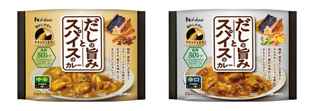ハウス食品は、かつお節や昆布のだしを使ったカレールー「だしの旨みとスパイスのカレー」を発売。中辛と辛口の2種で、辛さごとに、だしやスパイスの組み合わせを変えている。一般的な固形ルーに比べ脂質は半分で、軽やかな口当たりだという。溶かしやすい粉末状のルーを採用した。2皿分に個包装した3袋入りで、参考小