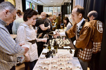 兵庫県産の酒米「山田錦」を使った日本酒を試飲する参加者=24日、ブリュッセルの日本大使館