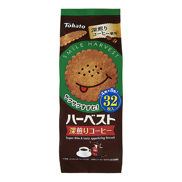 商品概要:「ハーベスト」シリーズ新アイテム。深煎りコーヒーを生地に練り込み、香ばしく焼きあげた。ハーベストならではのサクサクとした食感とともに、深みのあるほろ苦い味わいを楽しめる。