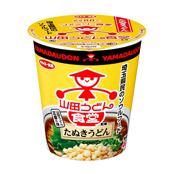 商品概要:埼玉県を中心に関東エリアのロードサイドで人気の山田うどん食堂とのコラボレーション。 麺は、表面につるみがあり、もっちりとした食感が特徴のうどん。丸刀を使用することで口当たりが滑らかな太麺に仕上げた。つゆは、山田うどん食堂のたぬきうどんの味を再現。鰹節、うるめ節、昆布のうまみに、醤油の味を合わせて仕上げた甘めのうどんつゆ。具材は、揚げ玉、ワカメ、ネギ。