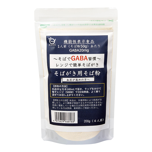 商品概要:高めの血圧を低下させる機能性表示食品。そば粉だけでGABAが摂取できる画期的な商品。そば粉に含まれるアミノ酸に着目し、独自の技術でGABAを増やした。血圧が高めの人に好適。鍋を使用しなくてもレンジ(500W3分)で簡単にそばがきが食べられる。一品追加したい時や小腹が空いた時、つまみなどに好適。