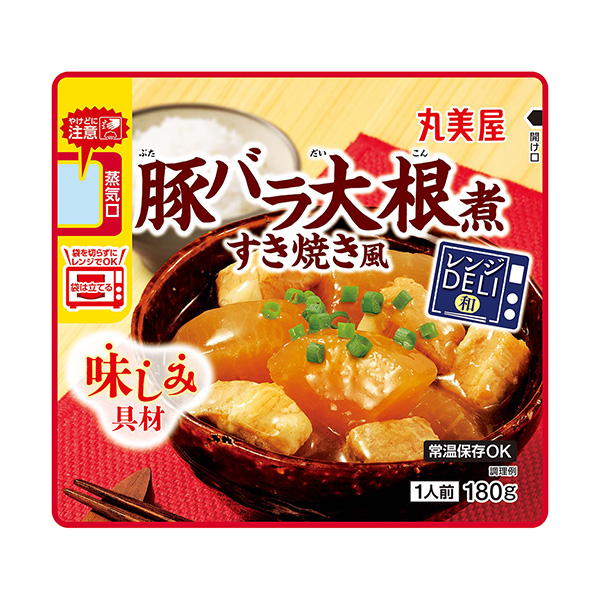 商品概要:「レンジ DELI」シリーズ新アイテム。袋ごと電子レンジで加熱するだけで、具材感のあるおかずが食べられる。常温で長期保存が可能なので買い置きにも便利。手作りするには手間のかかる、味がしみた豚バラ大根煮が手軽に味わえる。すき焼き風の甘辛醤油味に仕上げた。