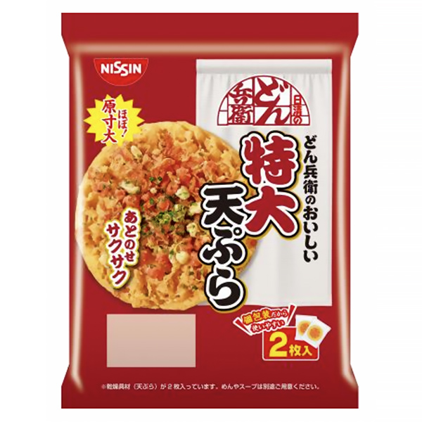 商品概要:「日清のどん兵衛のおいしい具材」シリーズ新アイテム。揚げたてのような食感が楽しめる、あとのせサクサクの特大天ぷら。かむほどにエビの香ばしい味わいが広がる。