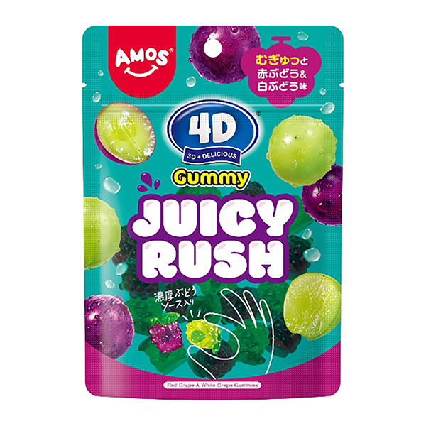 商品概要:「4Dグミ」シリーズ新アイテム。Amos社が展開している立体型グミキャンデーを活用した同社オリジナル商品。中に濃厚なブドウソースが入った<赤ぶどう>と<白ぶどう>の2種のフレーバーのアソート。グミ粒はAmos社の割型製法による精巧で立体的なかわいいブドウ型。立体だからこそ生み出される独特の食感と濃厚なブドウソースを楽しめる。