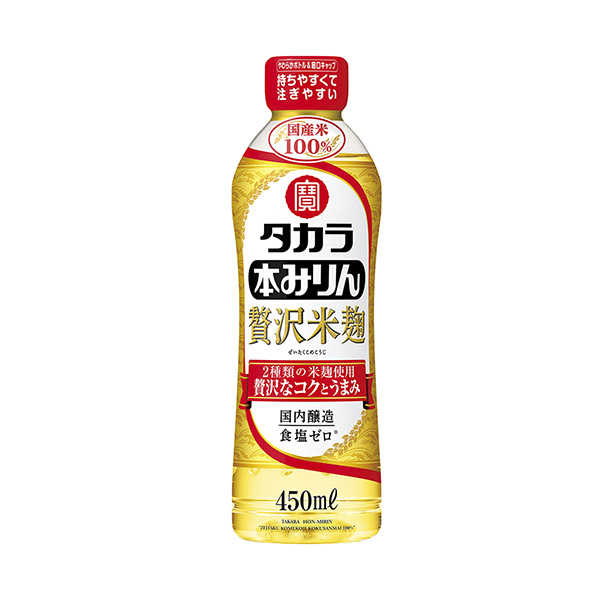 商品概要:「タカラ本みりん」シリーズ商品。アルコール分12.5度以上13.5度未満。3.5度未満国産米100%の安心感に、2種類の米麹を使用することでコク、うまみを強化した、ぜいたくな造りの本みりん。コメの甘みを引き出す黄麹と、うまみを豊富につくる白麹を使用することで料理にぜいたくなコクとうまみを与える。くびれたデザインで手にフィットするやわらかボトルと、注ぎやすく量を調整しやすい細口キャップを採用した、利便性の高い新容器。