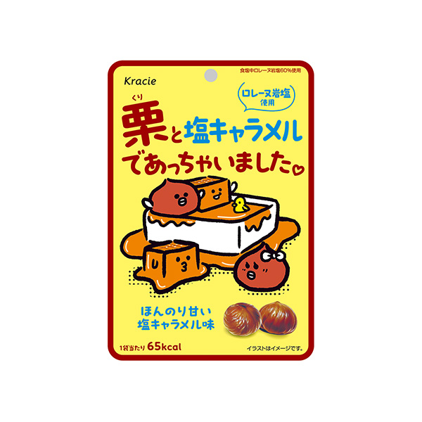 商品概要:「甘栗むいちゃいました」シリーズ新アイテム。若年層にむき栗を広げる第2弾施策商品。「甘栗むいちゃいました」と同じ特選A級有機栽培栗を使用。香ばしい栗にキャラメルソースを染み込ませ、ロレーヌ岩塩をアクセントに加えた。甘みと塩味のバランスを何度も試作し、少量でも満足感のあるスイーツのような味。腹持ちがよく少量でも満足感が高い、ヘルシーな秋限定おやつ。国内で丁寧にレトルト加工された栗を使用。1袋65kcal、脂質0.5g、食物繊維2.1g入り。手でつまんでもベタベタしない