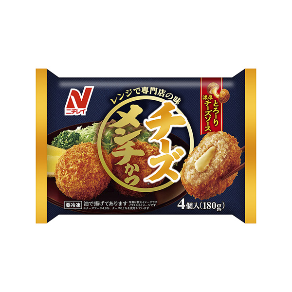 商品概要:レンジ調理で手軽に専門店品質を味わえるチーズメンチかつ。とろりとした食感の濃厚チーズソースを、豚、牛のひき肉で包んだ。ゴロっとした肉の食感とチーズソースの味わいがマッチし、ご飯のおかずはもちろん、パンに挟むのも好適。チーズフード4.9%、チーズ0.1%を使用。調理方法は、電子レンジ。
