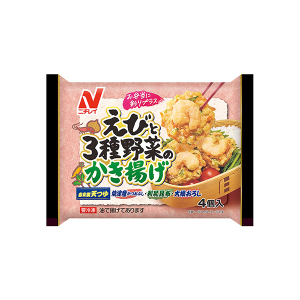 商品概要:プリッとした食感のエビと3種の野菜(玉ネギ、ニンジン、葉大根)を使用したかき揚げ。自家製だしを使用した天つゆが、食欲をそそる。具材の色合いにもこだわり、弁当の彩りに好適な一品に仕上げた。調理方法は、電子レンジ。