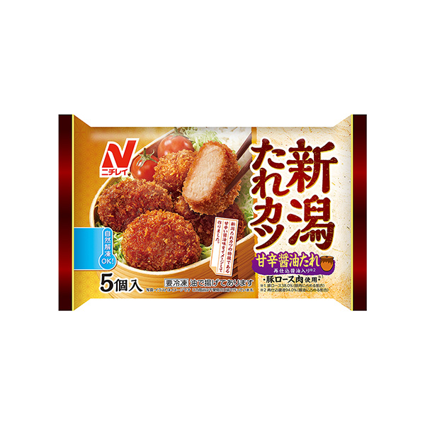 商品概要:甘辛醤油のたれに、豚カツをくぐらせた、たれカツ。特製のたれは、新潟ご当地メニューのたれカツを参考に、醤油、砂糖、昆布エキスを使用。弁当のおかずはもちろん、ご飯にのせるたれカツ丼アレンジも好適。調理方法は、電子レンジ、自然解凍。