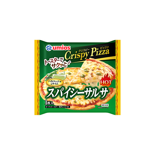 商品概要:「Crispy Pizza」シリーズ新アイテム。生地の厚みと焼き加減にこだわり、サクッとした食感を楽しめるピザ。特製のうま辛サルサソースと、ハラペーニョのあとひく爽やかな辛さ。調理方法は、オーブントースター、オーブン、電子レンジ。