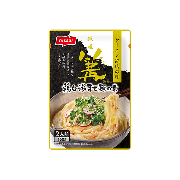 商品概要:ラーメン店、銀座 篝(かがり)監修。鶏白湯味のストレートタイプのまぜ麺の素。鶏のうまみを凝縮した、クリーミーかつ濃厚な鶏白湯の味を楽しめる。うどんなど、好きな麺に合わせて使用できる。