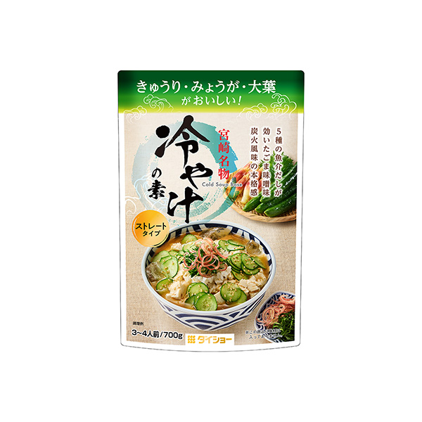 商品概要:冷や汁は、味噌に素焼きした魚のほぐし身やすりごまを合わせてだしでといて冷やし、野菜などの具材をのせたご飯にかけて食べる宮崎県の郷土料理。合わせ味噌に、ねりごまのコクと5種の魚介だし(鰹節、宗田節、煮干しエキス、ノドグロエキス、タイエキス)のうまみを加え、炭火の風味をほんのり利かせたストレートタイプのかけ汁。ご飯にキュウリ、木綿豆腐をのせ、冷やした同品をかければ出来上がり。薬味に刻んだミョウガがや大葉をトッピングしたり、サバ缶をプラスしたりするのも好適。