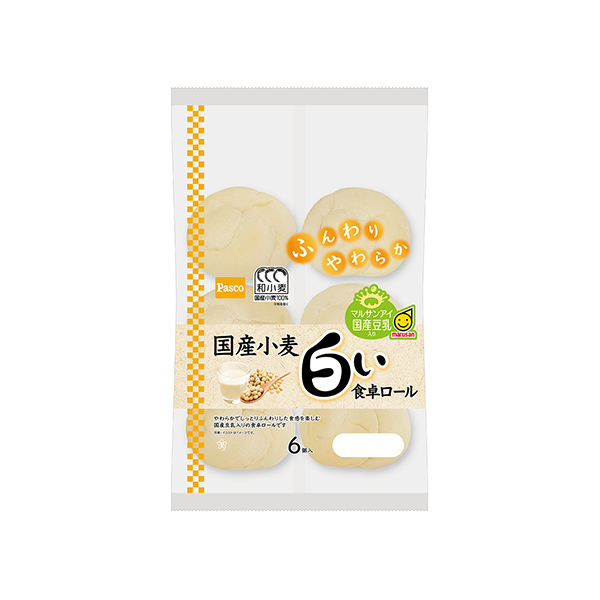 商品概要:「国産小麦」シリーズ商品。 国産小麦の小麦粉を100%使用(手粉を除く)に配合を変更。 柔らかでしっとりふんわりした食感を楽しむ、豆乳入りの食卓ロール。マルサンアイの国産豆乳を使用。