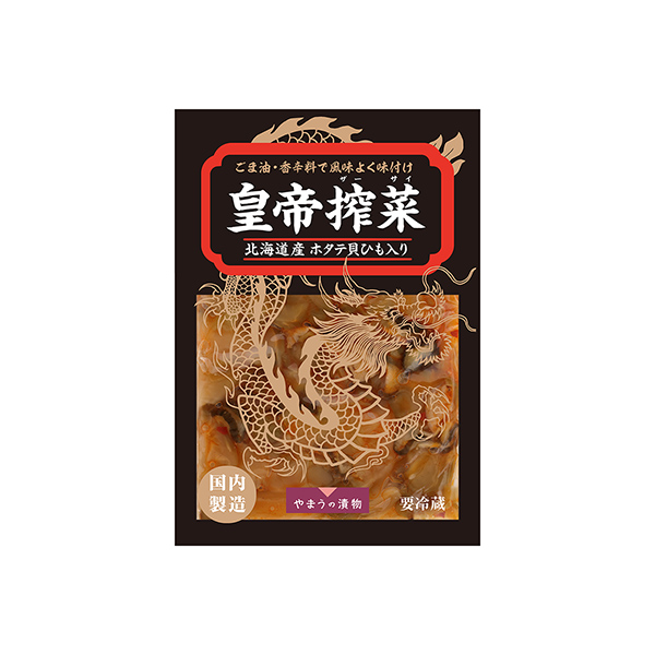商品概要:塩漬けして乳酸発酵させたザーサイをさらに香辛料に漬け、食感の良い厚切りにした。コリコリ食感と豊かな香辛料の風味が楽しめる。北海道産ホタテ貝ひもと輪切りキュウリを合わせ、各種香辛料とごま油の香味、貝ひもと超特選薄口醤油のうまみを利かせた。素材ごとに異なる歯切れが絶妙に調和し、一口ごとに異なる食感が楽しめる。風味の利いたコリコリ食感のザーサイは酒のつまみに好適。そのままでも、チャーハンや炒め物の具にしても、幅広く利用できる。