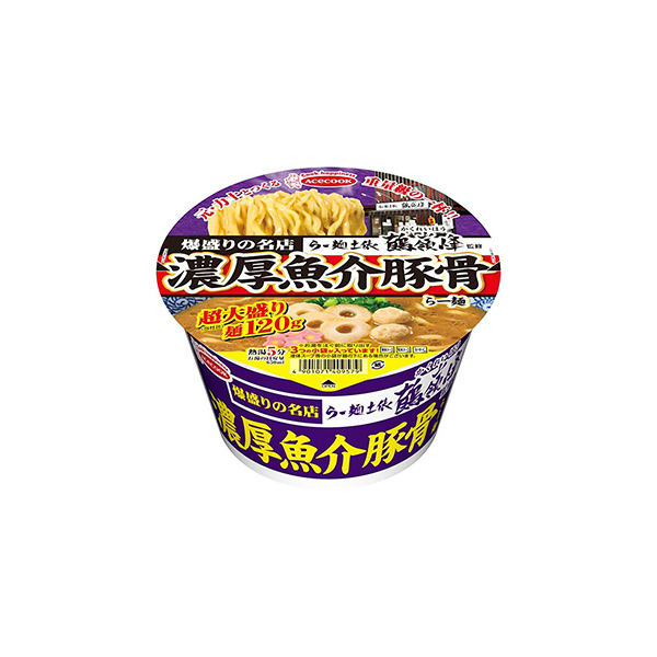 商品概要:「爆盛りの名店」シリーズ第2弾。爆盛りの人気店、らー麺土俵鶴嶺峰監修。麺は、しっかりとした弾力と滑らかさを併せ持つ角刃の太麺。口の中で存在感をしっかりと感じられる、食べ応え抜群の麺に仕上げた。湯戻し時間5分。スープは、ポークをベースに、カツオのうまみや玉ネギの甘みを加えた魚介豚骨醤油スープ。別添の液体スープでラードのうまみを加え、らー麺土俵鶴嶺峰らしい濃厚な一杯に仕上げた。かやくは、豆腐鶏団子、麩、ネギ、魚肉練り商品。