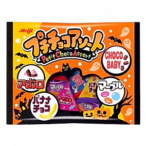A=「プチチョコアソート(袋)」アポロ、マーブル、チョコベビー、バナナチョコ、4種の人気小粒チョコをアソート。それぞれの個装にはハロウィンにまつわるクイズやアミダくじ、絵探しなどの仕掛けを付加し、ハロウィンを楽しく演出する。