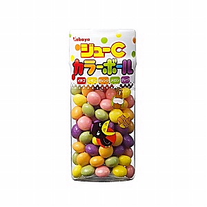 A=「ジューCカラーボール」透明な容器にカラフルなラムネが詰まり、見た目も楽しい。グレープ(紫)、レモン(黄色)、イチゴ(赤)、オレンジ(だいだい)、メロン(黄緑)の5つの味と色が容器の中にミックスした糖衣ラムネ。
