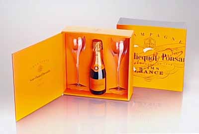イエローラベルのピッコロボトル(200ml)とヴーヴ・クリコのロゴ入りのシャンパーニュグラス2脚のセット。