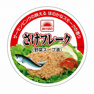 A=「あけぼの さけフレーク」皮と骨を取り除いた白サケのフレークを野菜スープとオイルに漬け込んだ。ツナ缶とはひと味違う、サーモンピンクが映える素材缶詰。ツナに比べて色変わりしにくいため、使用時に料理の彩りを損なわない。おにぎりやまぜご飯などの中種としても利用できる。